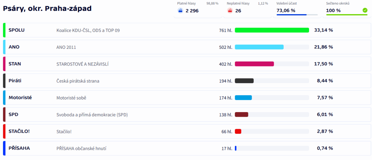 04.10.2025Volby v naší obci vyhrála koalice SPOLU s 33,14% hlasů, druhé bylo ANO2011 s 21,86% a třetí Starostové a nezávislí s 17,50%. Celková účast byla 73,06%.