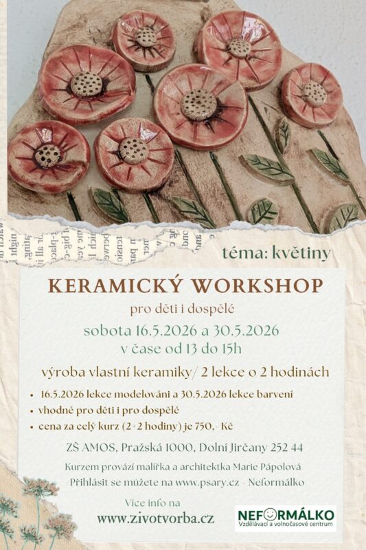 Zveme Vás na workshop keramiky probíhající 16.5. a 30.5.2026 v prostorech ZŠ AMOS pod vedením naší lektorky Marie Pápolové.