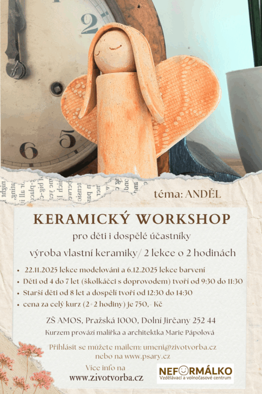 Zveme Vás na workshop keramiky probíhající 22.11. a 6.12.2025 v prostorech ZŠ AMOS pod vedením naší lektorky Marie Pápolové.