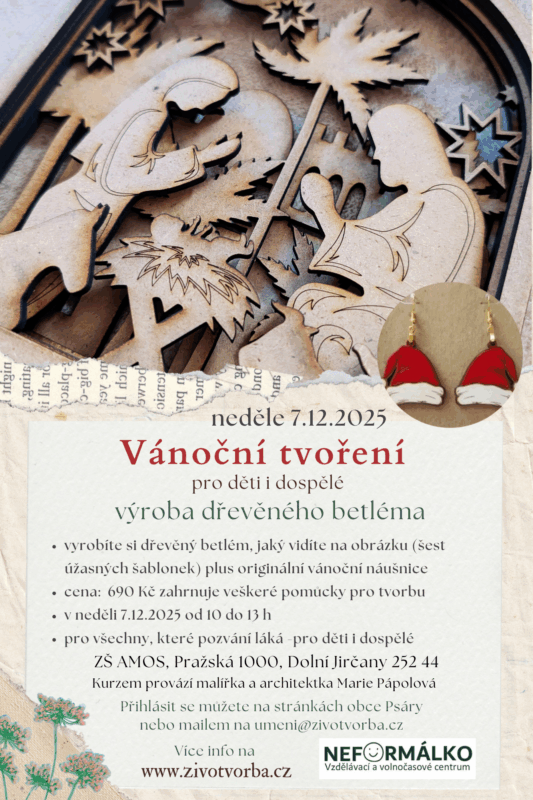 Přijďte si vyrobit dřevěný betlém pomocí šablonek na workshop konaný 7.12.2025 v ZŠ AMOS pod vedením naší zkušené lektorky malířky a architektky Marie Pápolové.