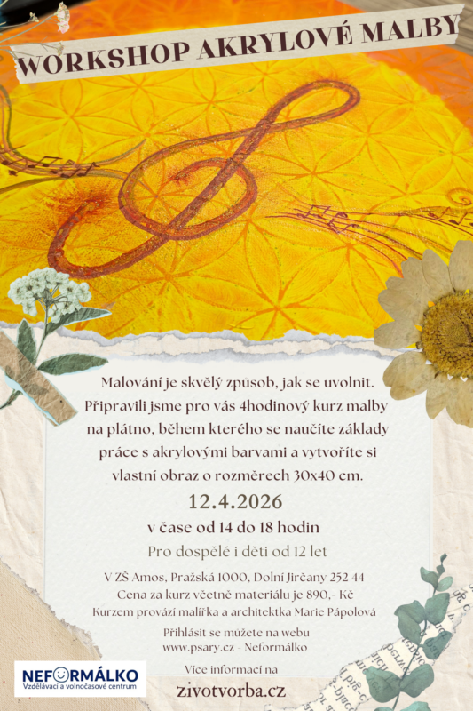 Přijďte si vyrobit originální malbu a třeba i dárek pro své blízké na workshop „Akrylová malba“ konaný 12.4.2026 v ZŠ AMOS pod vedením naší zkušené lektorky malířky a architektky Marie Pápolové.