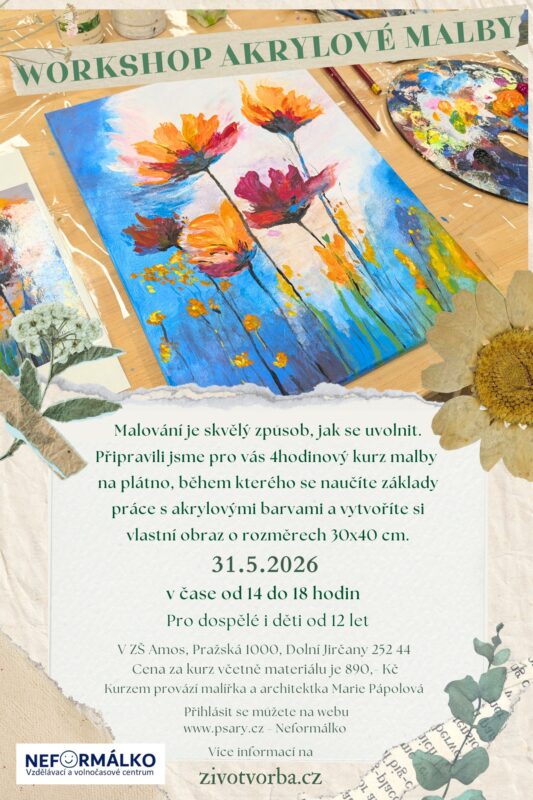 Přijďte si vyrobit originální malbu a třeba i dárek pro své blízké na workshop „Akrylová malba“ konaný 31.5.2026 v ZŠ AMOS pod vedením naší zkušené lektorky malířky a architektky Marie Pápolové.