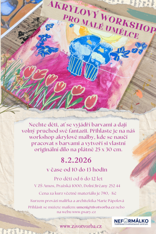 Přijďte si vyrobit originální malbu a třeba i dárek pro své blízké na workshop „Akrylová malba“ konaný 8.2.2026 v ZŠ AMOS pod vedením naší zkušené lektorky malířky a architektky Marie Pápolové.