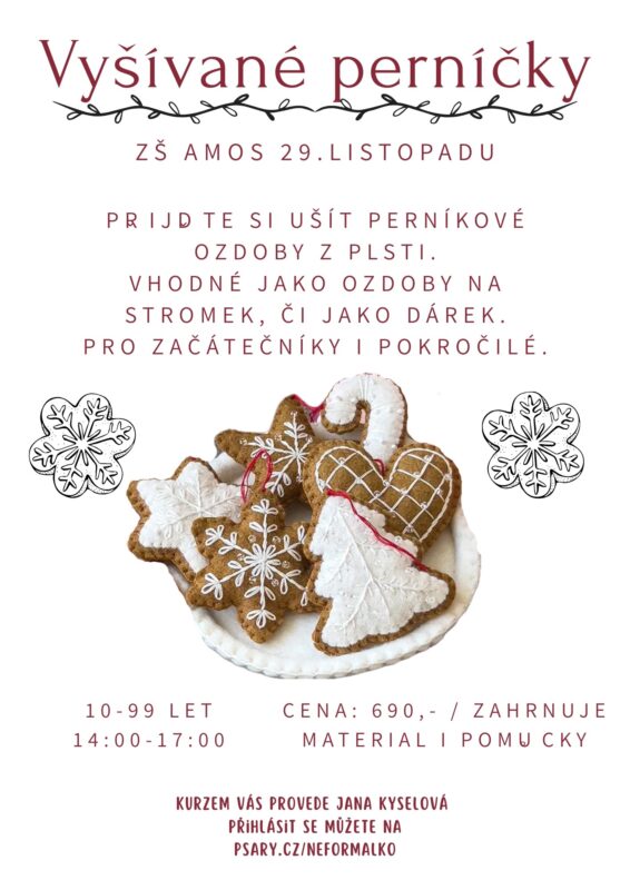 Přijďte si ušít perníkové ozdoby z plsti. Vhodné jako ozdoby na stromeček, či jako dárek. Vhodné pro začátečníky i pokročilé dne 29.11.2025 od 14 do 17 hodin do ZŠ AMOS.