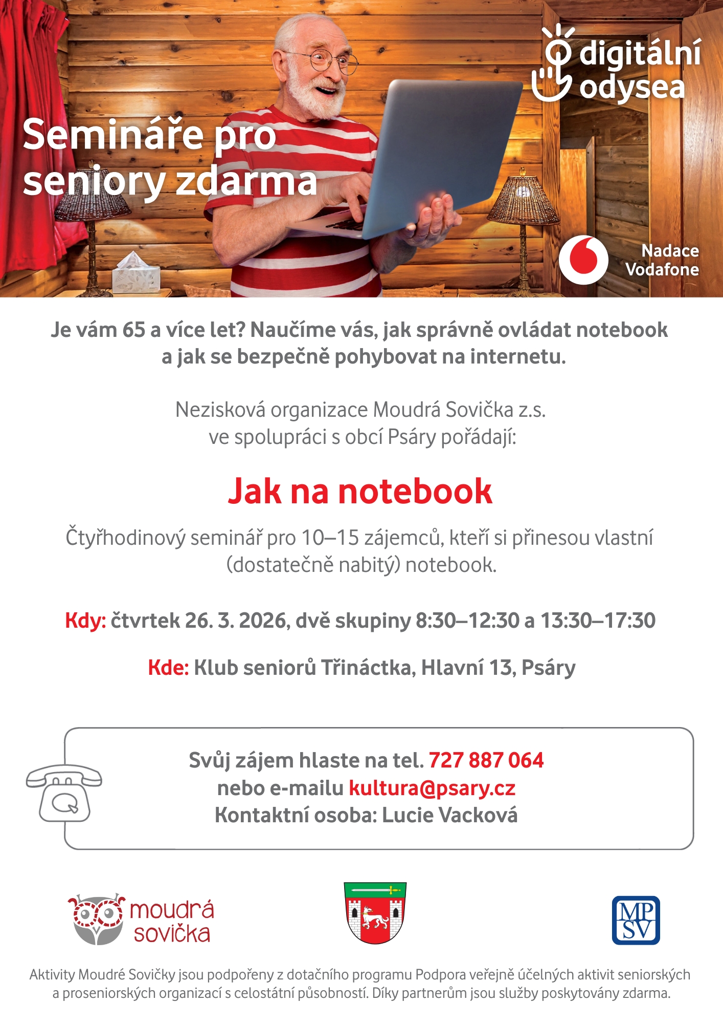 Je vám 65 a více let? Naučíme vás, jak správně ovládat notebook a jak se bezpečně pohybovat na internetu. Vybrat lze ze dvou termínů: 26.3., 8.30 - 12.30 a 13.30 - 17.30. Rezervace místa na kultura@psary.cz.