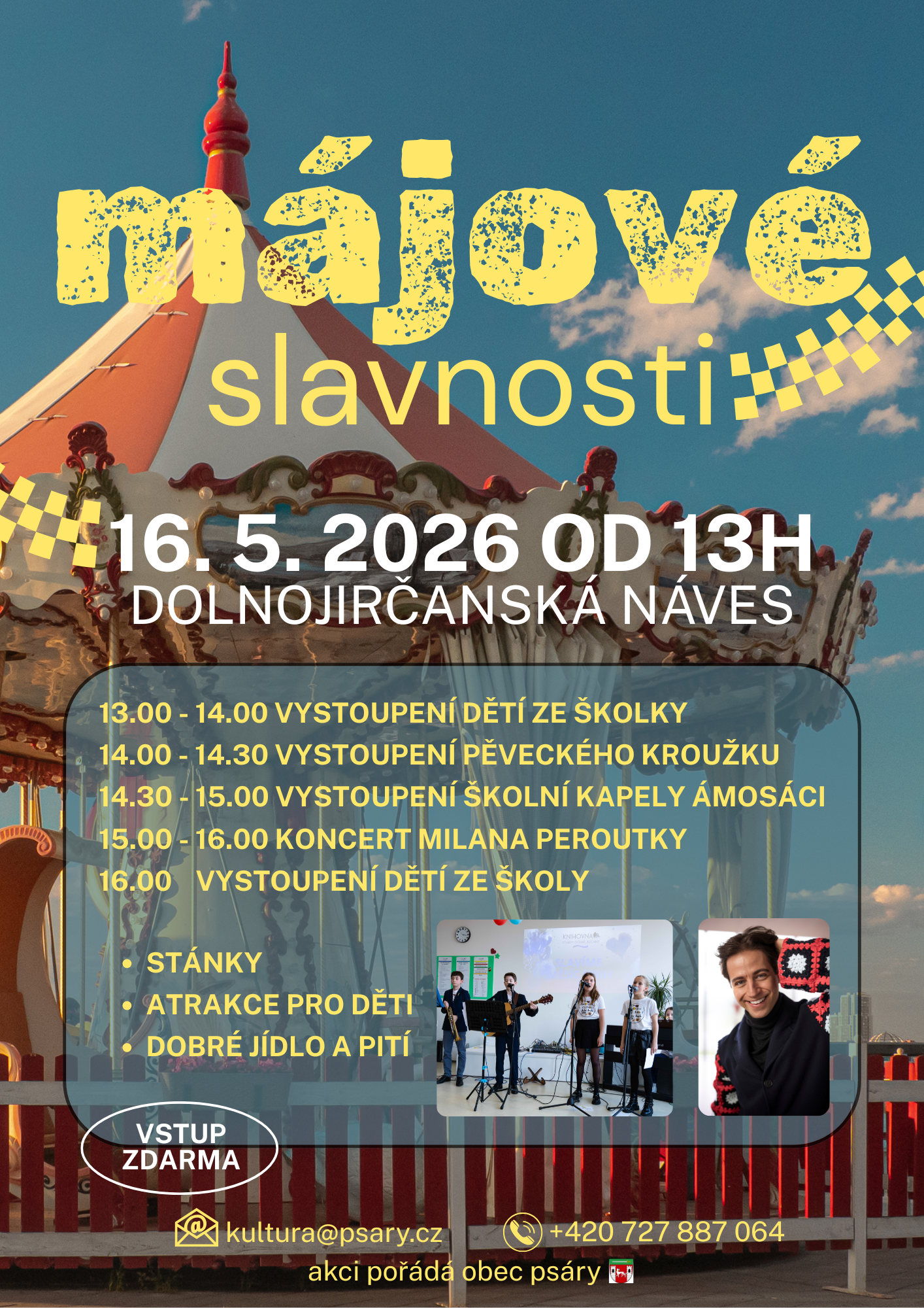 🌸 Májové slavnosti Srdečně vás zveme na Májové slavnosti, které se budou konat 16. 5. 2026 na dolnojirčanské návsi. Těšit se můžete na: 🎭 vystoupení dětí ze školky a školy 🎪 bohatý doprovodný program 🛍️ stánky a kolotoče 🍔 dobré jídlo a pití 🎤 Pěveckým hostem bude Milan Peroutka.