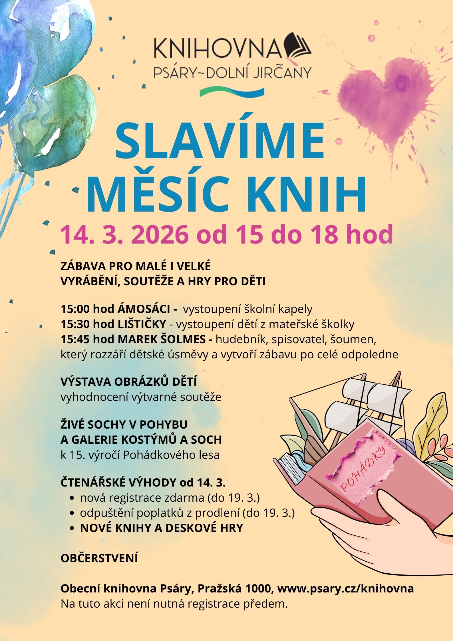 Srdečně zveme všechny malé i velké čtenáře v sobotu 14. 3. 2026 od 15 hodin na pestrý program plný zábavy. Vystoupí školní kapela Ámosáci, hostem odpoledne bude hudebník, spisovatel a šoumen Marek Šolmes. Těšit se můžete také na výstavu dětských obrázků s vyhodnocením nejlepších prací a také společně oslavíme 15. výročí Pohádkového lesa – včetně živých soch a galerie kostýmů. Připraveno je vyrábění, soutěže pro děti a drobné občerstvení venku před knihovnou. Na tuto akci není nutná rezervace předem. Po celý týden od 9. do 15. března 2026 navíc platí čtenářské výhody – nová registrace zdarma a odpuštění poplatků z prodlení.